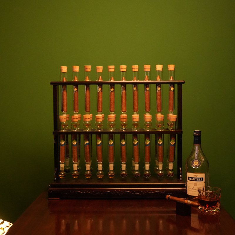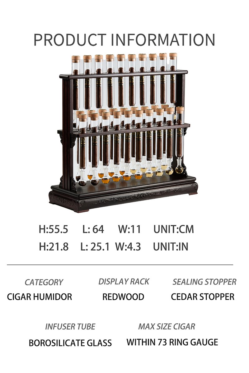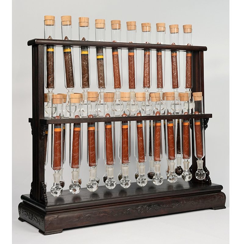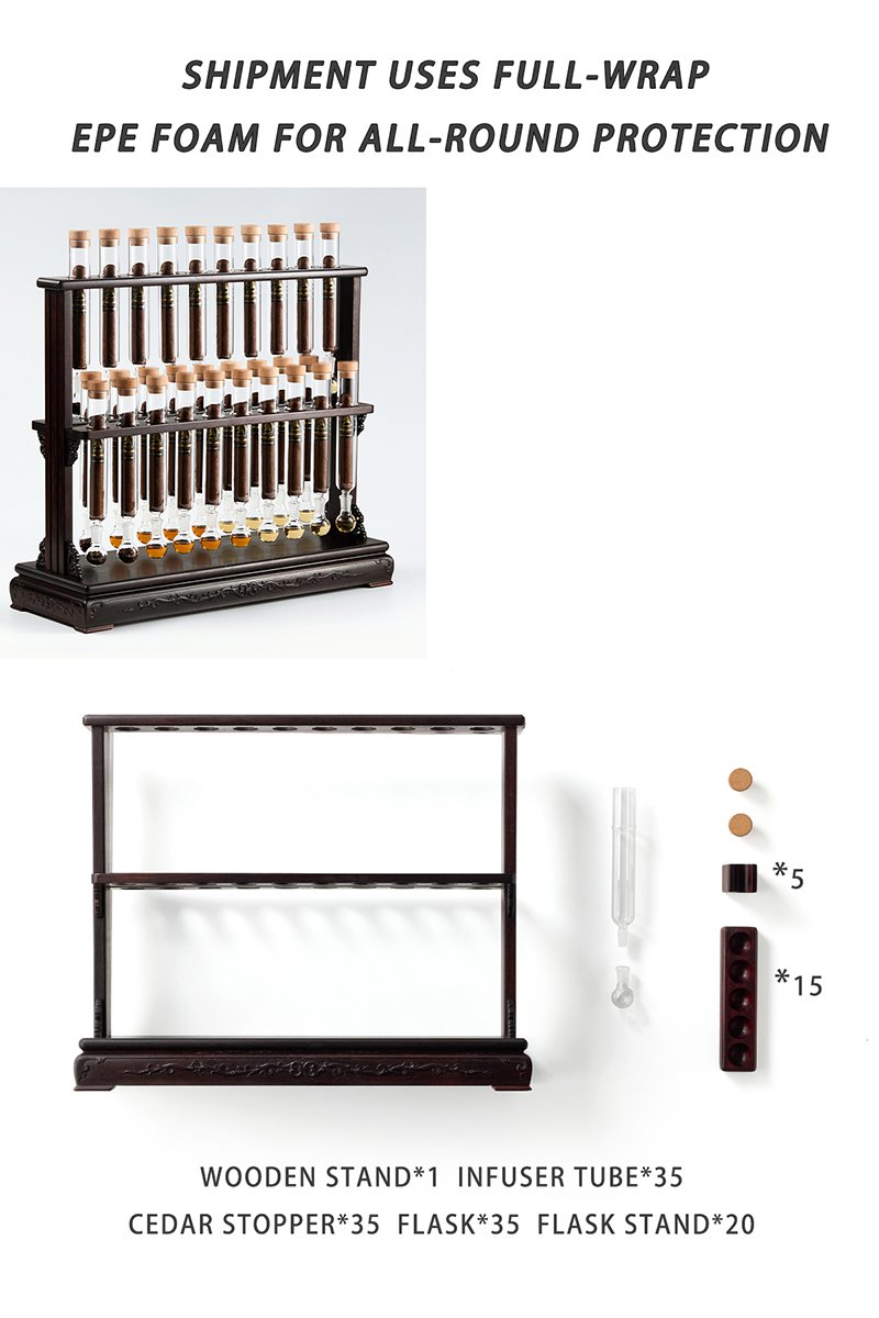 Handcrafted-Redwood Stand*1 , Five Flask Base*3, Cigar Holder*5 High Borosilicate Glass Infuser Tube*35, Flask*35 Spanish Cedar Stopper*35
