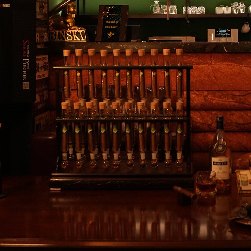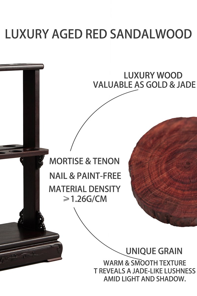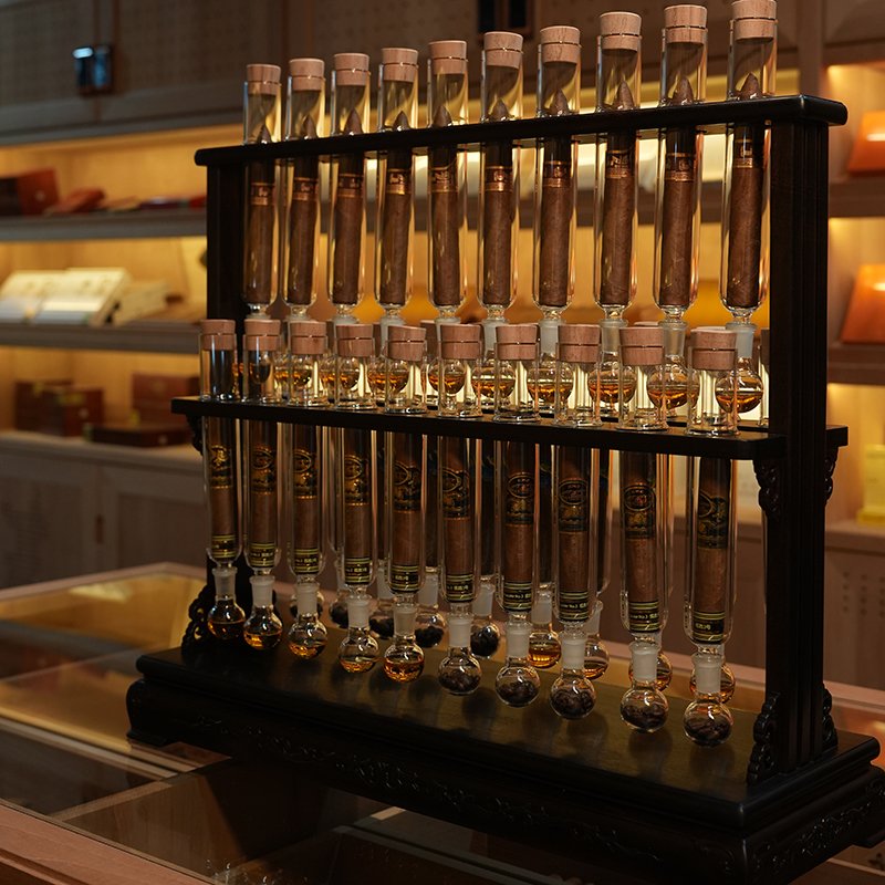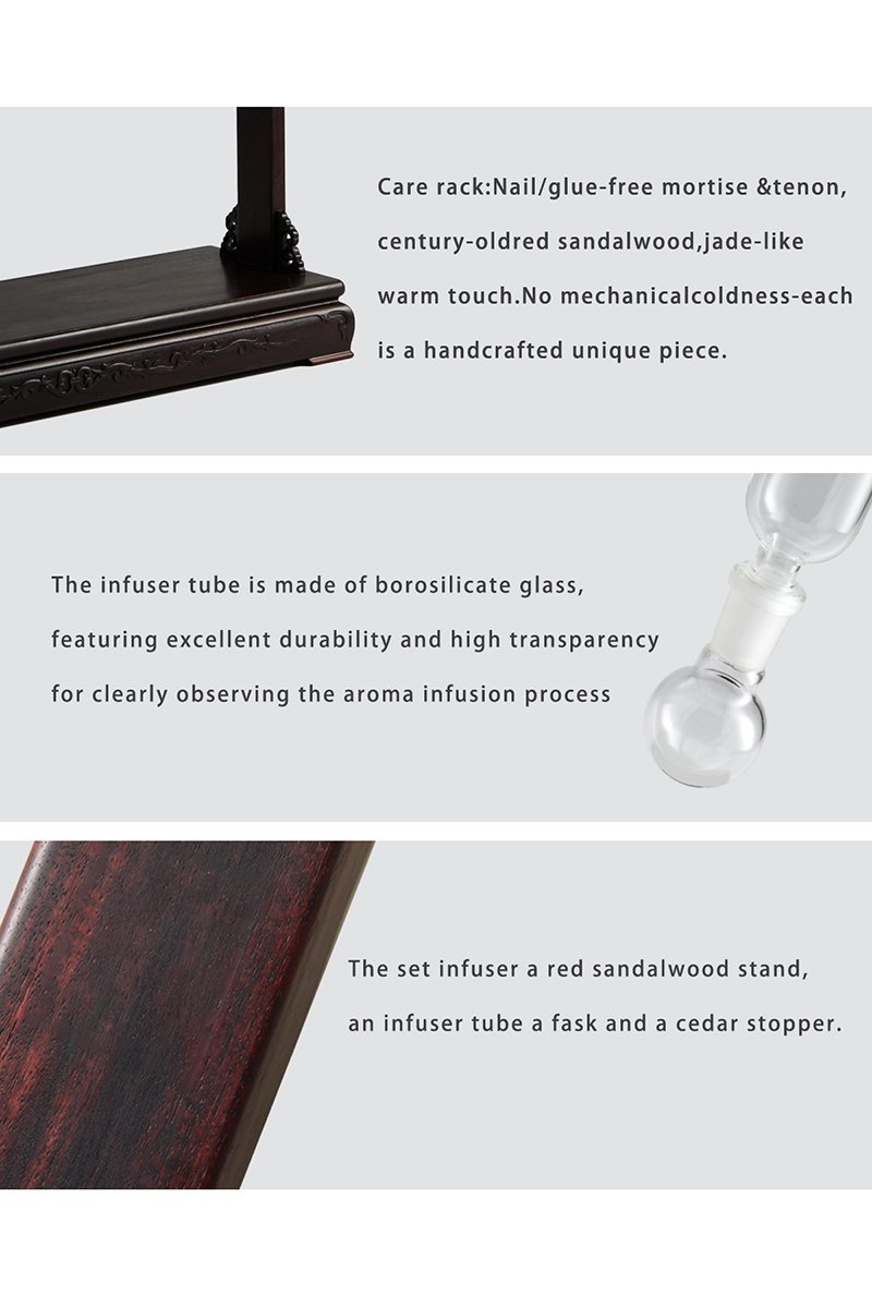 Handcrafted-Redwood Stand*1 , Five Flask Base*3, Cigar Holder*5 High Borosilicate Glass Infuser Tube*35, Flask*35 Spanish Cedar Stopper*35